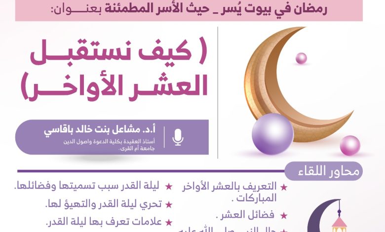 جمعية يسر للتنمية الأسرية بمكة المكرمة تقيم مساء غد الأربعاء لقاء بعنوان ( كيف نستقبل العشر الأواخر ؟)