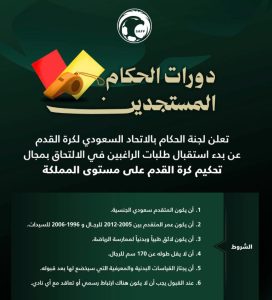 وأكدت اللجنة أن هذه الدورة تمثل فرصة للراغبين في دخول مجال التحكيم وبناء مسيرة رياضية احترافية، ضمن منظومة عمل مؤسسية تقوم على التطوير المستمر وبناء الكفاءات الوطنية التي تمثل مستقبل التحكيم السعودي.