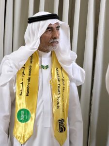 وقام الاستاذ سعيد بن علي بن جمعان بتسلم الشيخ فواز محمد صالح باشراحيل الميدلية التذكارية لفريق كشافة شباب مكة المكرمة.